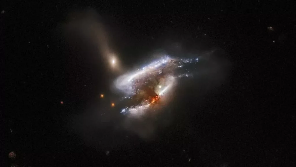 Con un movimiento en espiral a través del espacio, tres galaxias distantes chocan y se unen en una nueva y fascinante imagen captada por el telescopio espacial Hubble de la NASA.