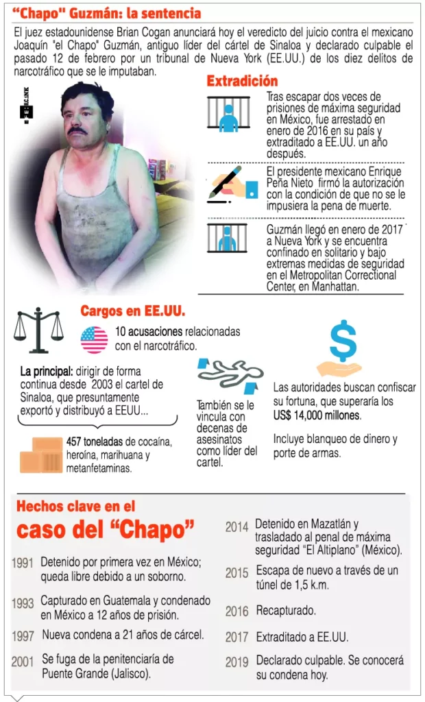 NUEVA YORK.-La Fiscalía de Estados Unidos, luego de formalizar su petición de cadena perpetua, más 30 años de prisión, contra el narcotraficante mexicano Joaquín “el Chapo” Guzmán, conocerá hoy la sentencia definitiva en un tribunal de Nueva York.