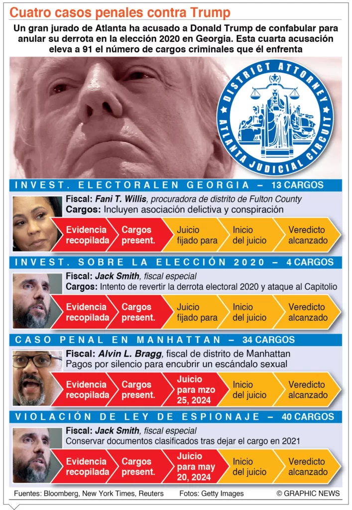 Tras más de dos años de investigaciones dirigidas por la fiscal Fani Willis, un gran jurado de Georgia imputó el lunes al expresidente por intentar manipular los resultados de las elecciones de 2020 en ese estado, donde el demócrata Joe Biden ganó por un estrecho margen.