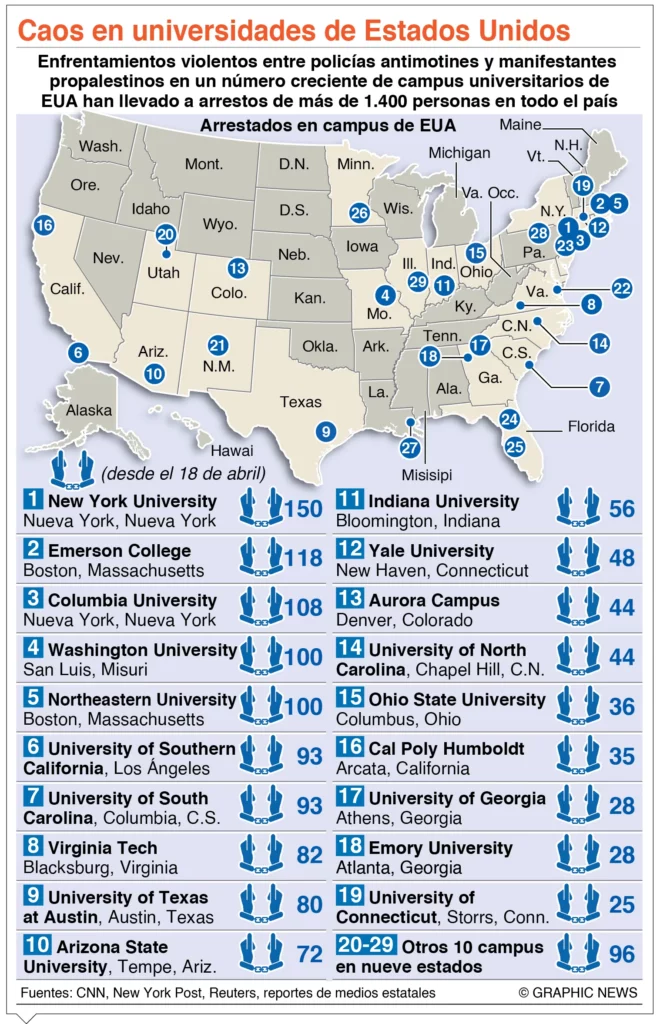 Las autoridades irrumpieron la noche del martes en el emblemático edificio Hamilton Hall (Universidad de Columbia), que horas antes había sido tomado por los estudiantes propalestinos. El operativo de desalojo que también fue ocupado en 1968 en protesta contra la guerra de Vietnam, tuvo un saldo de 282 manifestantes detenidos.