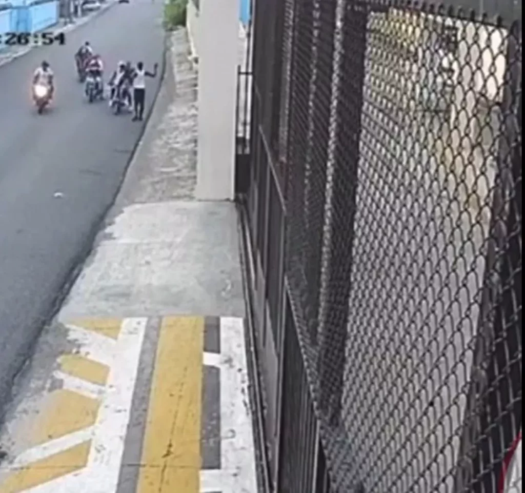 Cámaras de vigilancia captaron el momento cuando al menos ocho individuos motorizados asaltan a una persona que caminaba en los alrededores de la Zona Industrial de Herrera, en el municipio Santo Domingo Oeste.