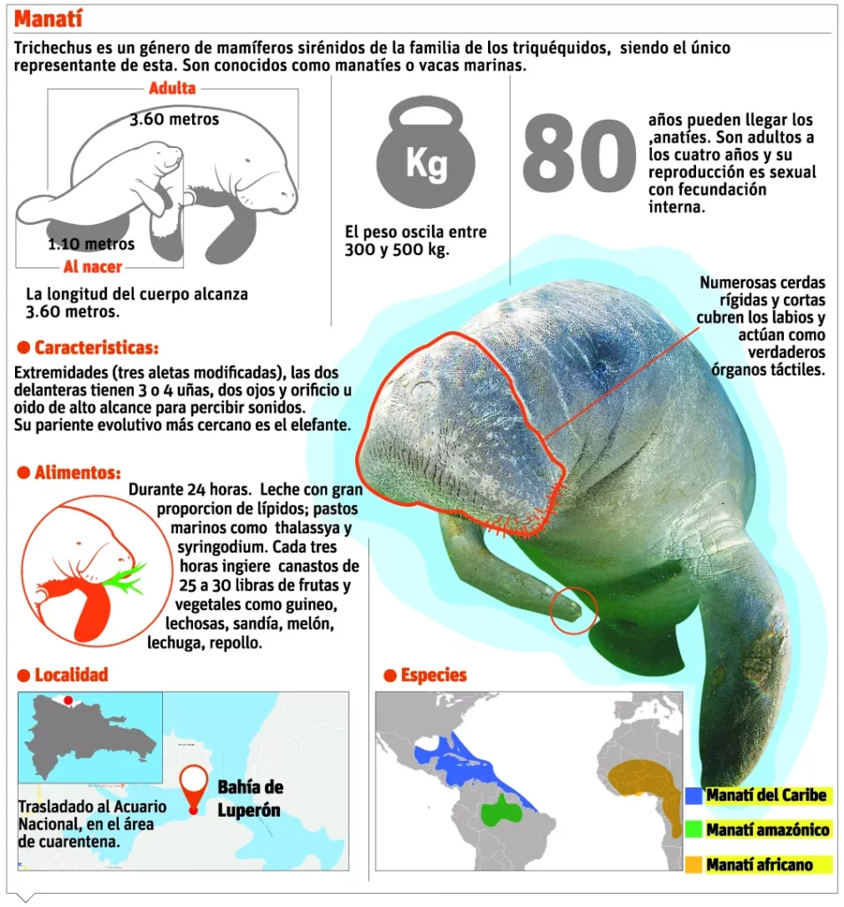 SANTO DOMINGO.-La manatí juvenil antillanus “Lupe” (Trichechus manatus manatus), rescatada el martes de unos manglares del estuario de la Bahía de Luperón, Puerto Plata, se encuentra estable y bajo supervisión continua de ocho veterinarios y dos biólogos del Acuario Nacional.