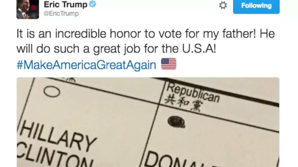 Washington.- Eric, uno de los hijos del candidato republicano a la Casa Blanca, Donald Trump, violó hoy una ley estatal de Nueva York que prohíbe hacer fotos a las papeletas electorales, al publicar en su cuenta de Twitter una imagen del voto que emitió por su padre.