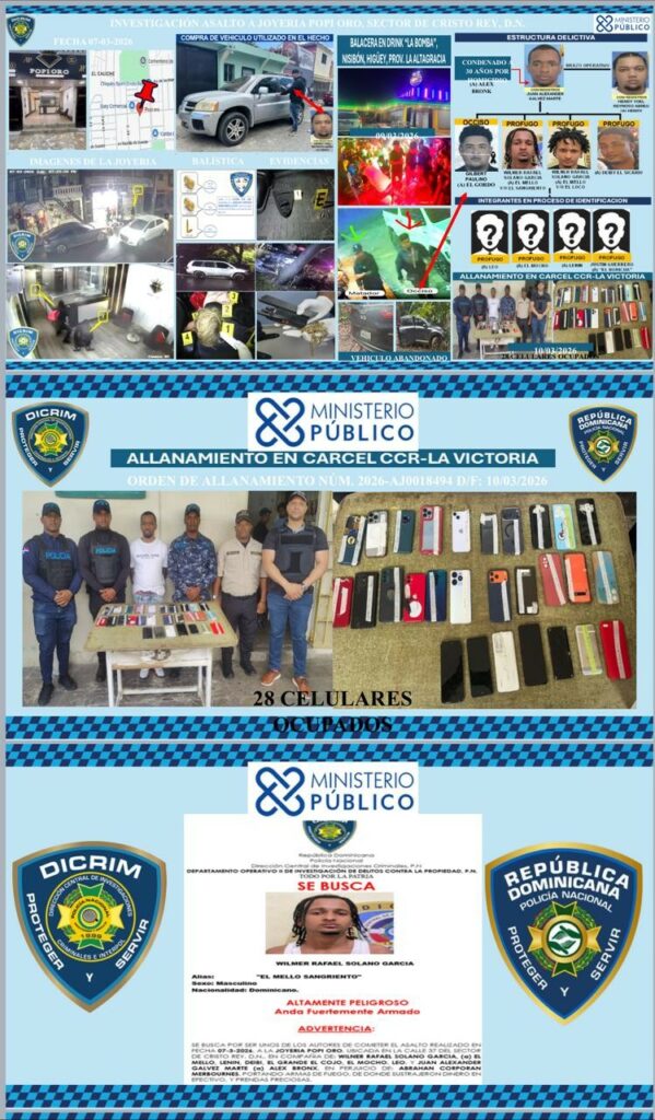 Las autoridades indicaron que el presunto coordinador del hecho delictivo fue identificado como Juan Alexander Gálvez Marte, alias “Alex Bronx”, quien cumple condena de 30 años en el Centro de Corrección y Rehabilitación La Victoria.