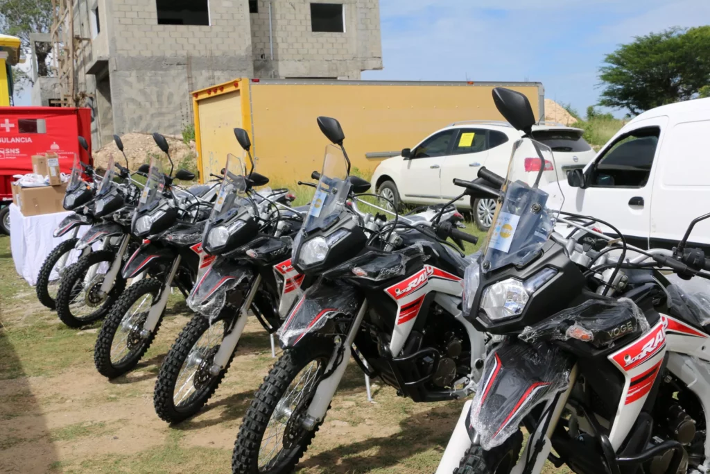 La entrega, que se hizo a través de la Dirección Provincial de Salud (DPS), Servicio Regional de Salud El Valle (SRS El Valle) y la Gerencia de Área de Salud 3 de Elías Piña; incluyó dos motoambulancias, seis motores, camillas, balanzas pediátricas, oxímetros, dopplers portátiles y lámparas de cuello de ganso, entre otros; se enmarca en el proyecto Champion Mothers (Madres Campeonas) que desarrolla el organismo en esa localidad fronteriza.