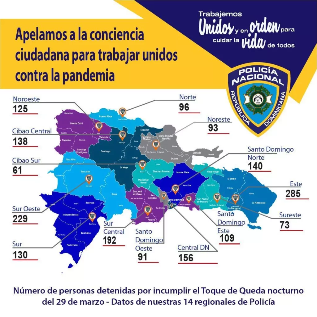 SANTO DOMINGO.-Durante los operativos correspondientes al pasado domingo 29 para hacer cumplir el toque de queda, unas 1,918 personas fueron detenidas por transitar sin justificación durante el periodo establecido.