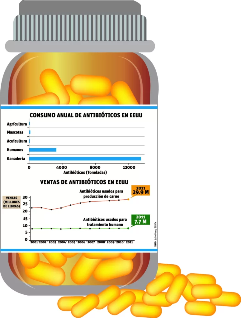 El siguiente grafico compara los volúmenes de venta de antibióticos para producción de carne y para tratamiento humano, como se puede ver, el primero cuadruplica el segundo..