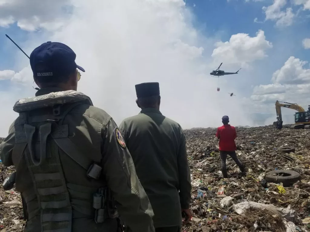 SANTO DOMINGO.-Dos helicópteros de la Fuerza Aérea Dominicana sobrevuelan desde este mediodía el vertedero de Duquesa y vierten agua para sofocar el fuego que ha provocado una humareda que cubre gran parte del Distrito Nacional, Santo Domingo Norte y Este desde el pasado domingo.