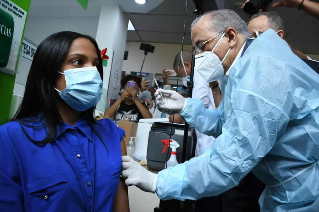 El ministro de Salud Pública aplicó en el Hospital Pedro E. Marchena, de Bonao, la vacuna a la enfermera Marifel Vásquez, la que de manera voluntaria firmó el consentimiento y recibió su tarjeta que la certifica con la primera dosis.