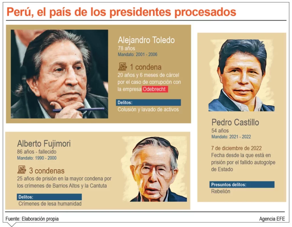 En la actualidad Pedro Castillo cumple una prisión preventiva de 18 meses. En ese orden, Alejandro Toledo se convirtió en el primer expresidente peruano en ser condenado por el caso Odebrecht. Está acusado de colusión y lavado de activos por los sobornos recibidos de la empresa brasileña.