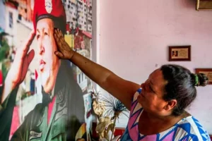 A woman touches a poster of the late President Hugo Chavez inside Santo Hugo Chavez del 23 chapel, at 23 de Enero community in Caracas on February 27, 2015. Next March 5, marks the second anniversary of Chavez’s death. The eternal proclaimed commander who directed the South American nation for more than a decade has left a void that neither his political heirs, nor opponents have been able to fill. AFP PHOTO/FEDERICO PARRA