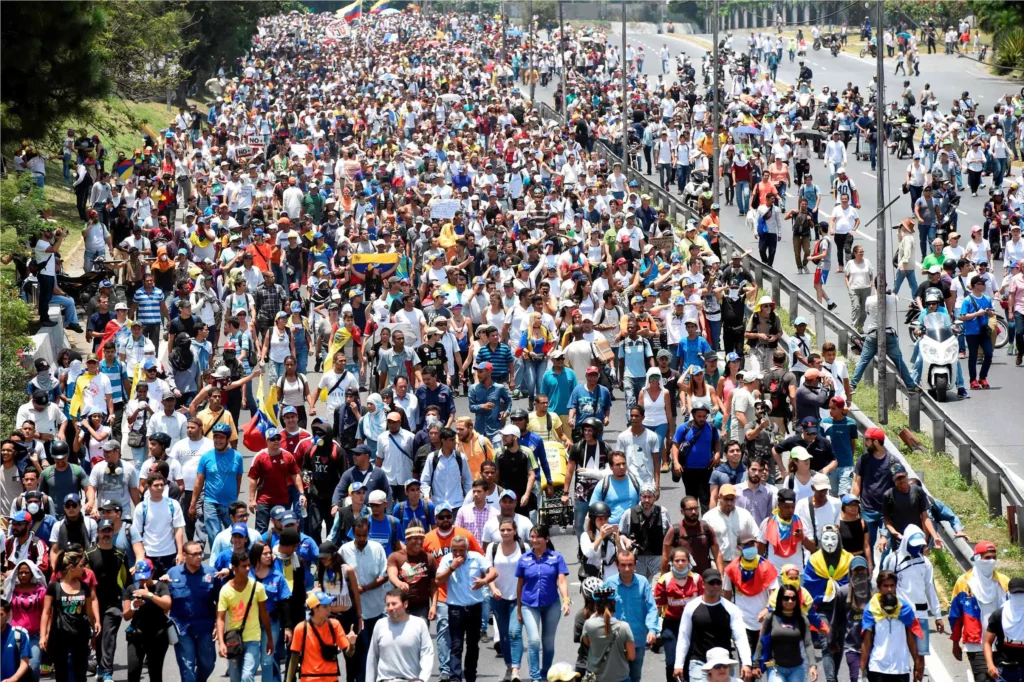 La marcha convocada por la coalición opositora partió desde 26 puntos de Caracas para confluir en la sede de la Defensoría de Pueblo, en el centro de la ciudad, que amaneció custodiada por guardias nacionales con equipos antimotines.
