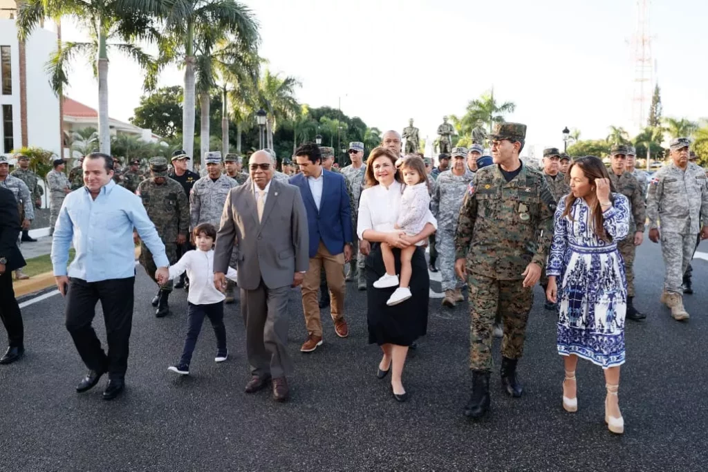 Saliendo desde el Monumento a los Padres de la Patria ubicado en la entrada de la sede del Ministerio de Defensa, la Vicepresidenta Raquel Peña junto al alto mando militar y comisiones de las diferentes dependencias de las Fuerzas Armadas, se dirigieron a la Plaza de la Bandera para entonar las notas del Himno Nacional interpretadas por la banda de Música del MIDE, mientras izaban la enseña tricolor que quedó durante el acto como un techo común para todos los presentes.