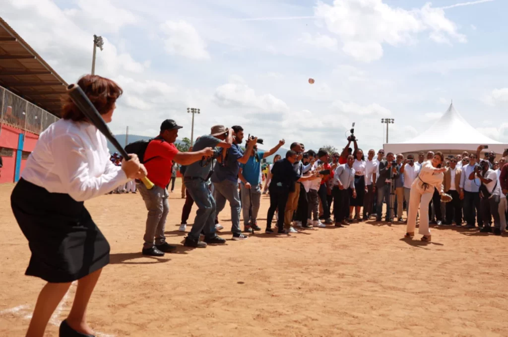 La bola recorrió con precisión la distancia desde el montículo hasta la mascota de José Canó, quien la atrapó con destreza. Ángela Jáquez, con el bate en mano, siguió la trayectoria del pitcheo, mientras el ingeniero Manuel Estrella, al igual que el público presente, lo decretó strike levantando el brazo derecho.