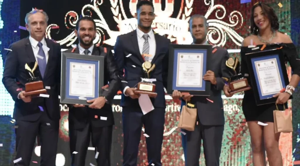 Santiago.-Los tocayos Víctor Estrella y Víctor Liz compartieron el galardón Atleta del Año 2016, en la gala presentada anoche en el Gran Teatro del Cibao, por la Asociación de Cronistas Deportivos de Santiago, con los auspicios de Cervecería Nacional Dominicana.