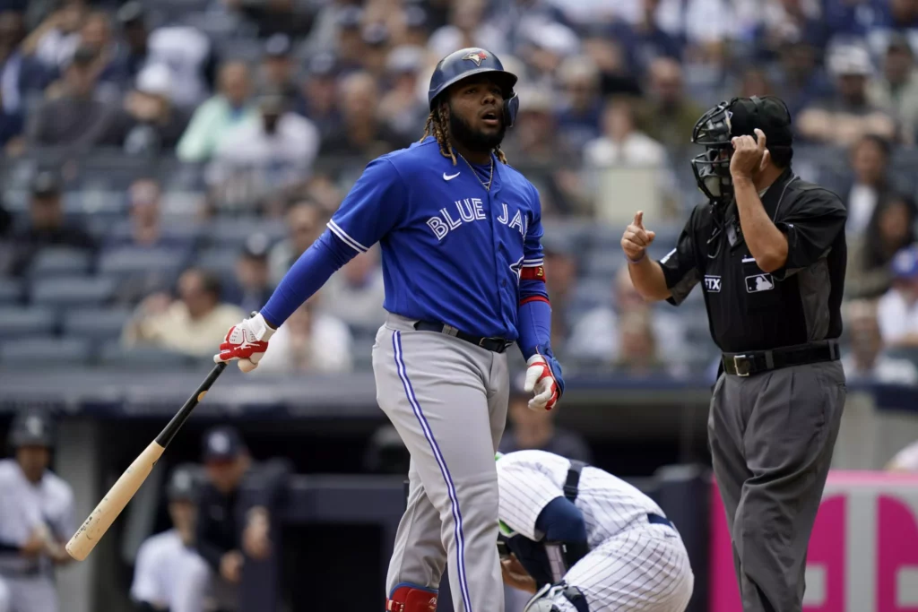 Con Bo Bichette en la intermedia y Toronto abajo 3-1 frente a los Yankees, Guerrero hizo swing en blanco ante un pitcheo con cuenta de 1-2. El quisqueyano golpeó el piso con el bate y luego lo chocó con su muslo, al buen estilo de Bo Jackson.