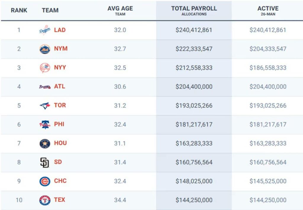 Los Blue Jays, por su parte, ocupan el quinto lugar entre todos los equipos de la MLB en cuanto a salario asignado para la temporada 2026, con $193 millones. Los únicos equipos con un salario superior son los LA Dodgers (US$240 millones), los New York Mets (US$222 millones), los New York Yankees (US$212 millones) y los Atlanta Braves ($204 millones).