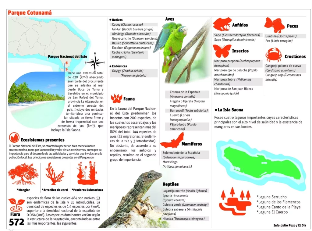 El Parque Nacional de Este posee lugares de conservación como arrecifes coralinos, praderas marinas, playa arenosa, dunas, vegetación, manglares, bosques húmedos, cavernas, manantiales, zonas de arte rupestre y restos arqueológicos prehispánicos.