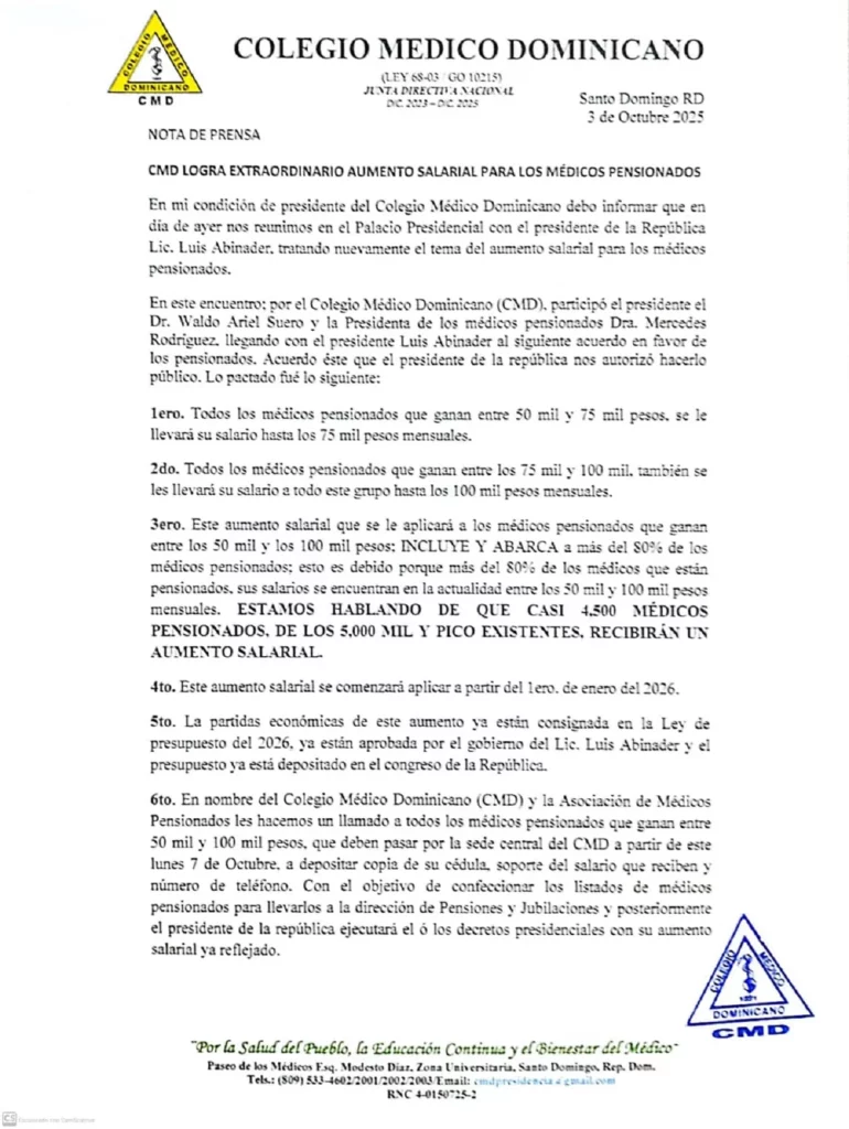 En el documento, el CMD detalla que el beneficio se aplica a todos los médicos pensionados, tanto a los que recién pasan al retiro como a los que ya estaban recibiendo una pensión. El ajuste, asegura el gremio, marca un precedente en la historia de las luchas médicas en el país.
