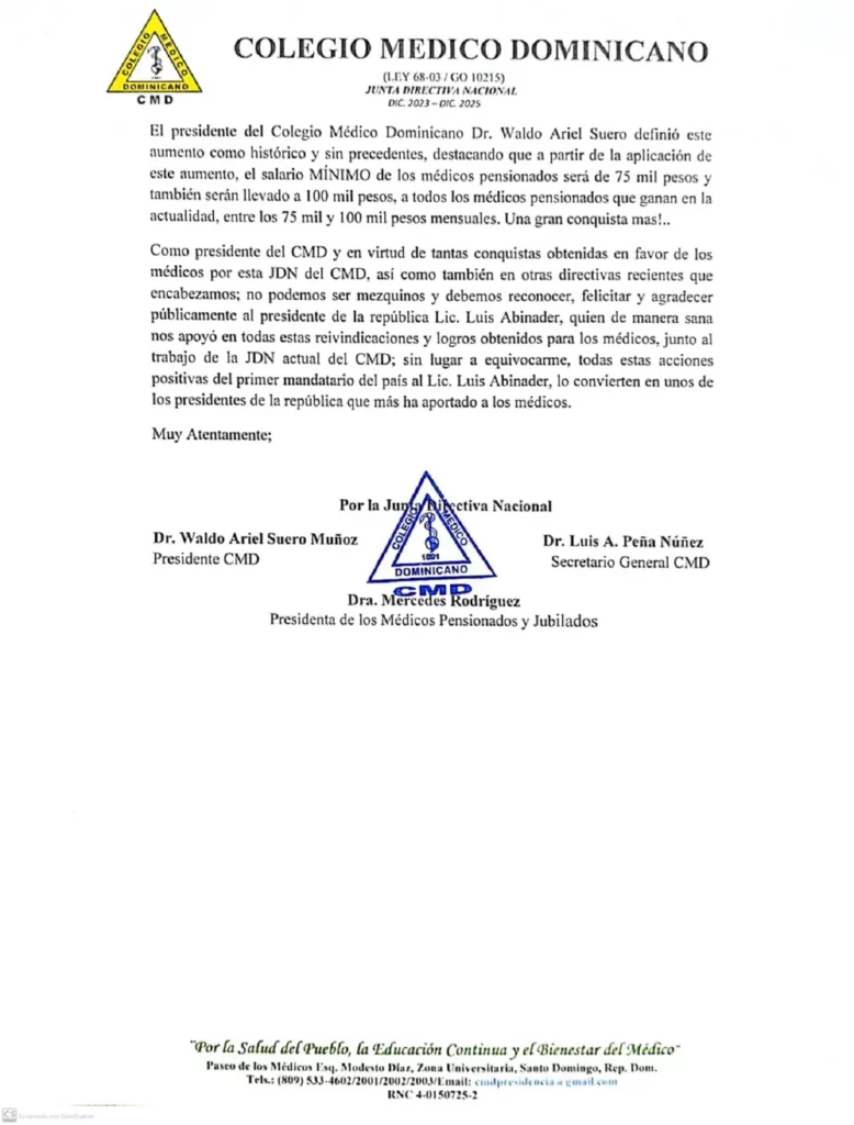 “Sin lugar a equivocarme, todas estas acciones positivas del primer mandatario del país, licenciado Luis Abinader, lo convierten en uno de los presidentes de la República que más ha aportado a los médicos”, manifestó Waldo Ariel en una comunicación en la que se anuncian los aumentos a los médicos pensionados.