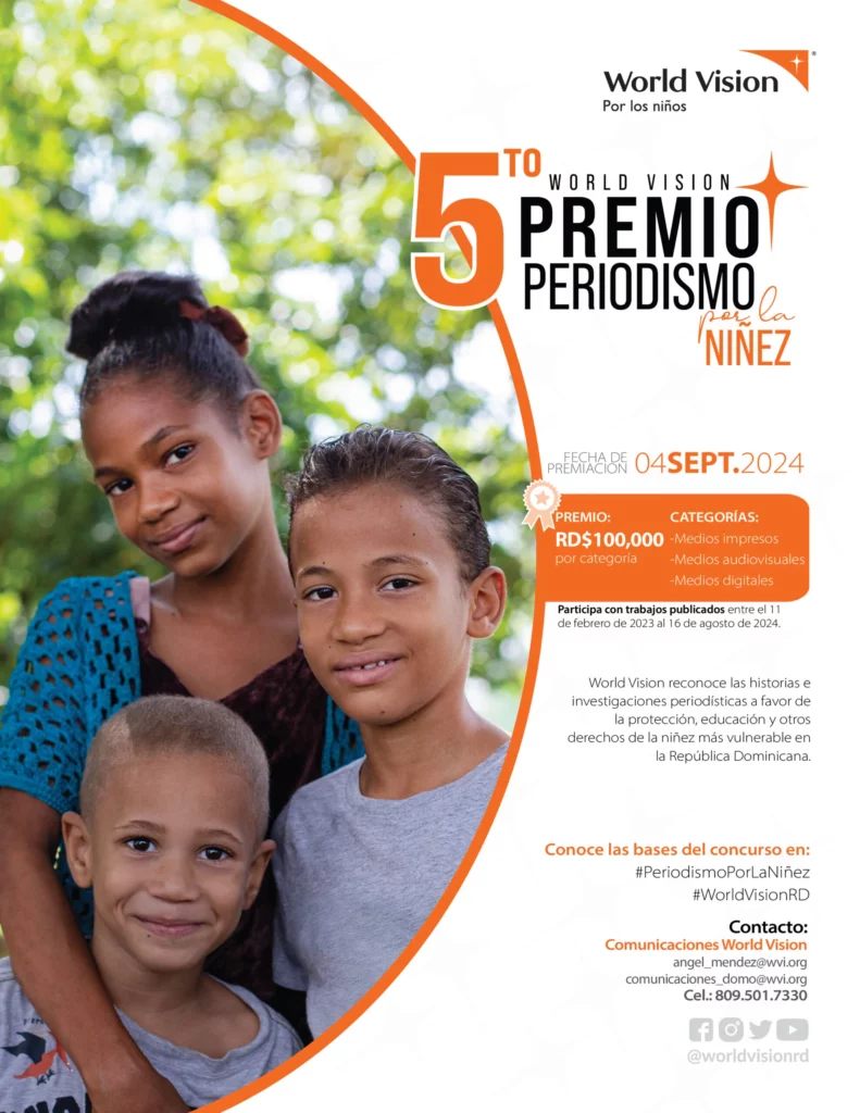 Santo Domingo.- La organización internacional World Vision República Dominicana lanza el “5to. Premio World Vision: Periodismo por la Niñez”, con el propósito fundamental de reconocer la labor de periodistas y comunicadores que producen trabajos para educar y sensibilizar a la población en temas que afectan a la niñez y la adolescencia para promover su protección, garantizar sus derechos fundamentales y su desarrollo integral.