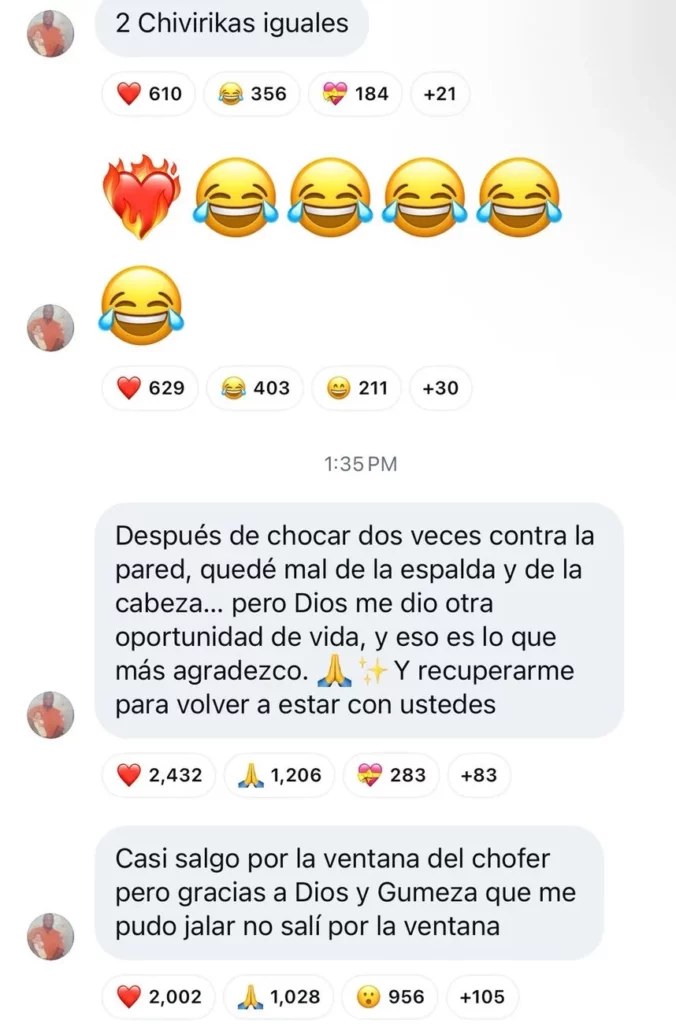 La cantante explicó que el impacto fue tan fuerte que casi sale por la ventanilla del lado del conductor, pero gracias a la intervención de Dios y de su acompañante, conocido como Gumeza, logró mantenerse dentro del vehículo. “Casi salgo por la ventana del chofer, pero gracias a Dios y Gumeza que me pudo jalar no salí por la ventana”, añadió.